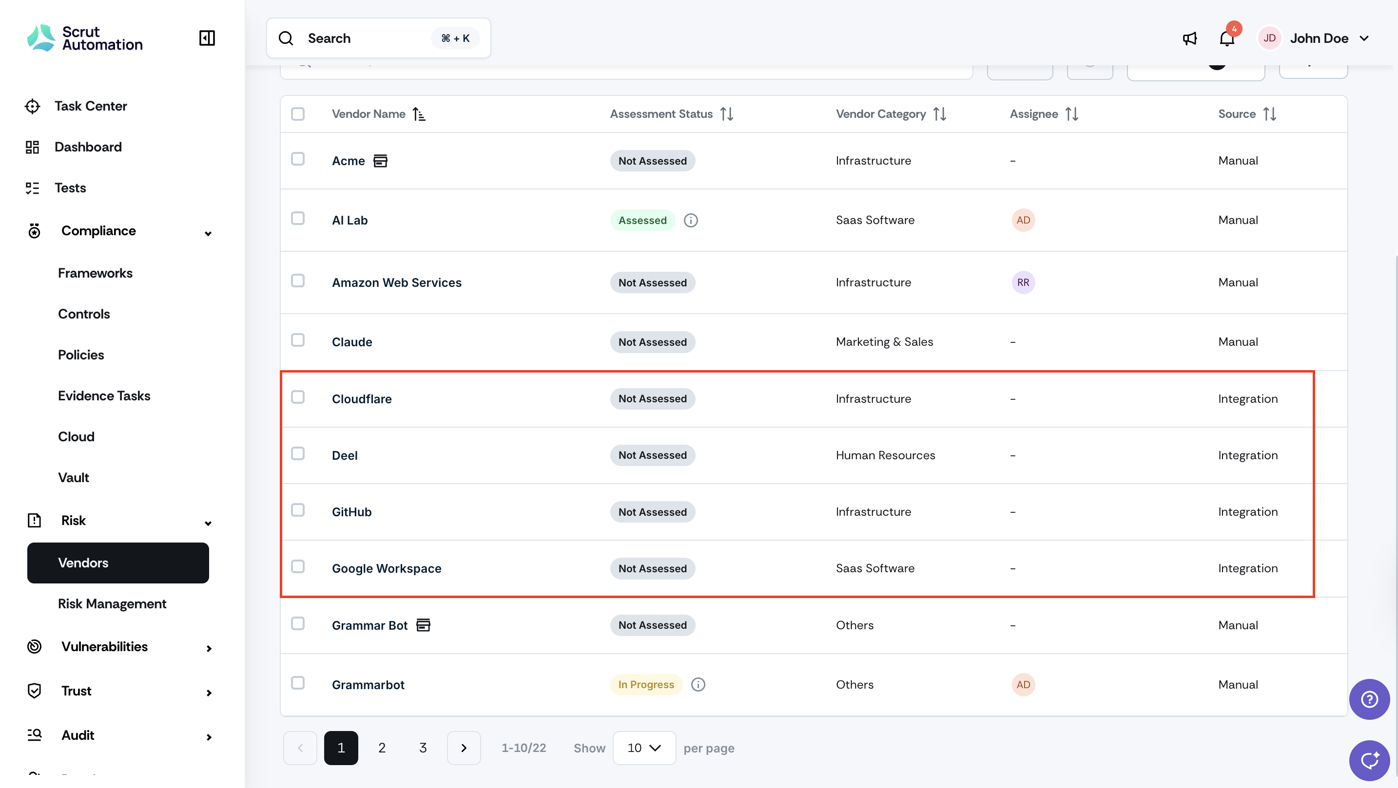 • Click Risk -> Vendors on the left navigation panel, and go to the Vendors tab to open the Vendor Table. The Source column is now visible by default and identifies integration-synced vendors.