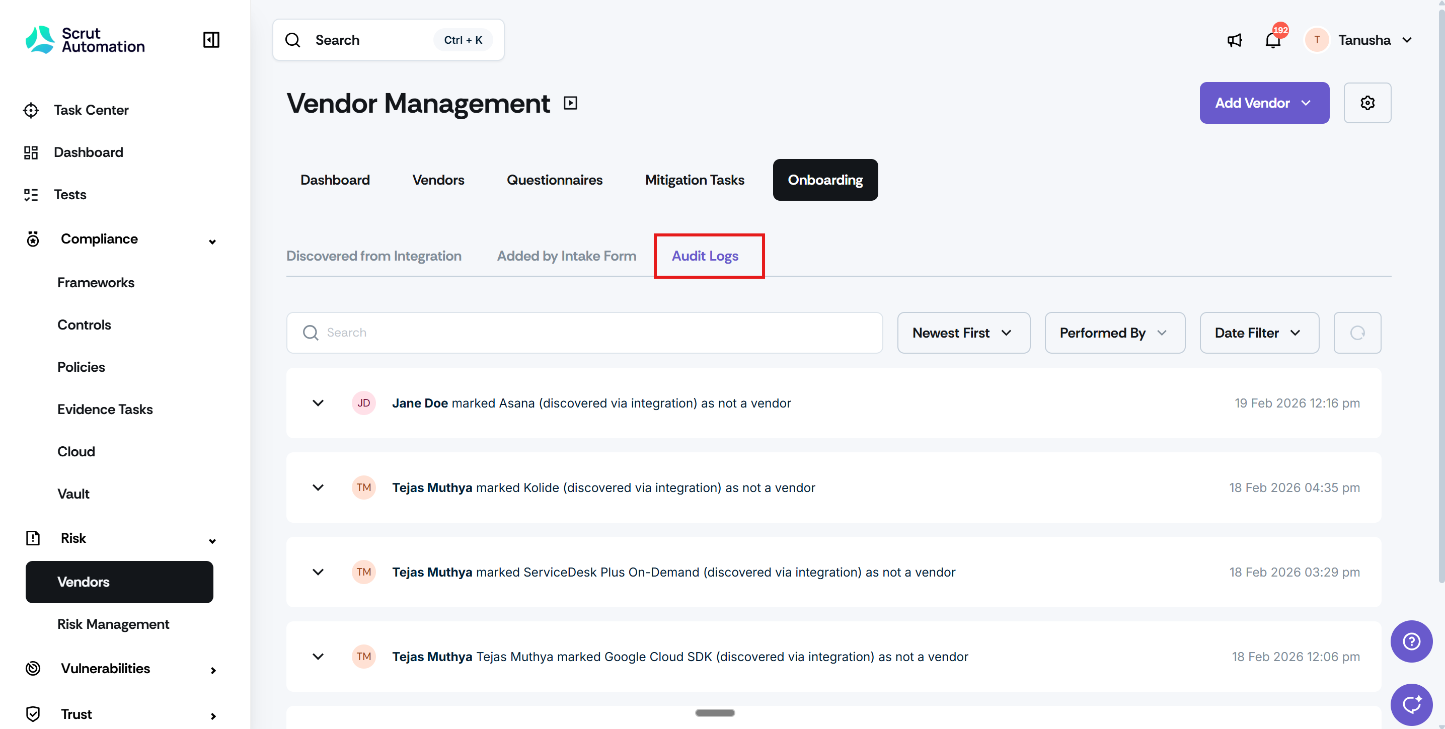 • Navigate to Risk -> Vendors -> Onboarding and open the new Audit Logs sub-tab to review a log of key actions taken on discovered vendors, including marking a vendor as "not a vendor".