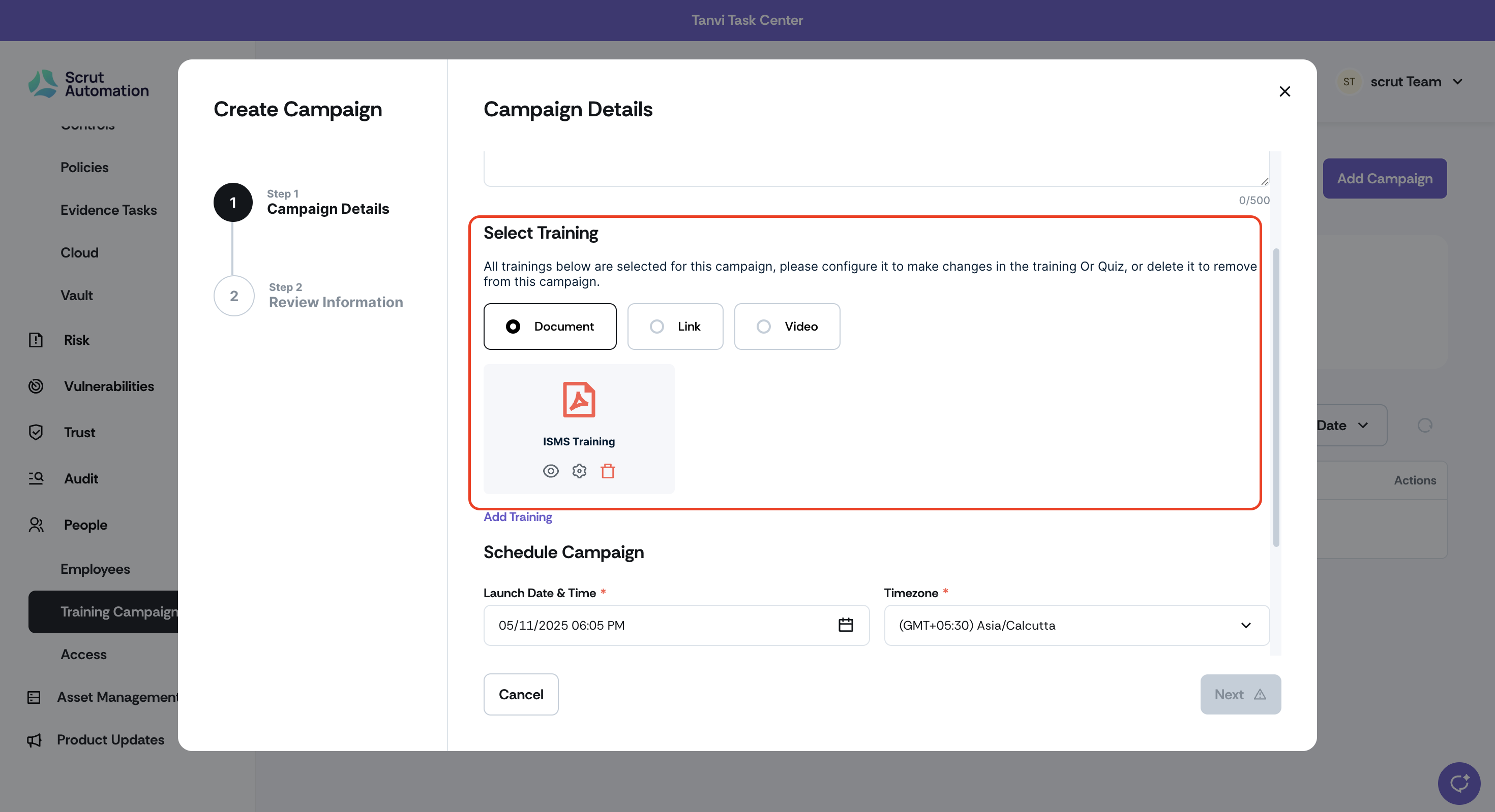 When creating or editing employee training campaigns, you'll now see only training modules linked to your purchased frameworks. Irrelevant training options are automatically filtered out.