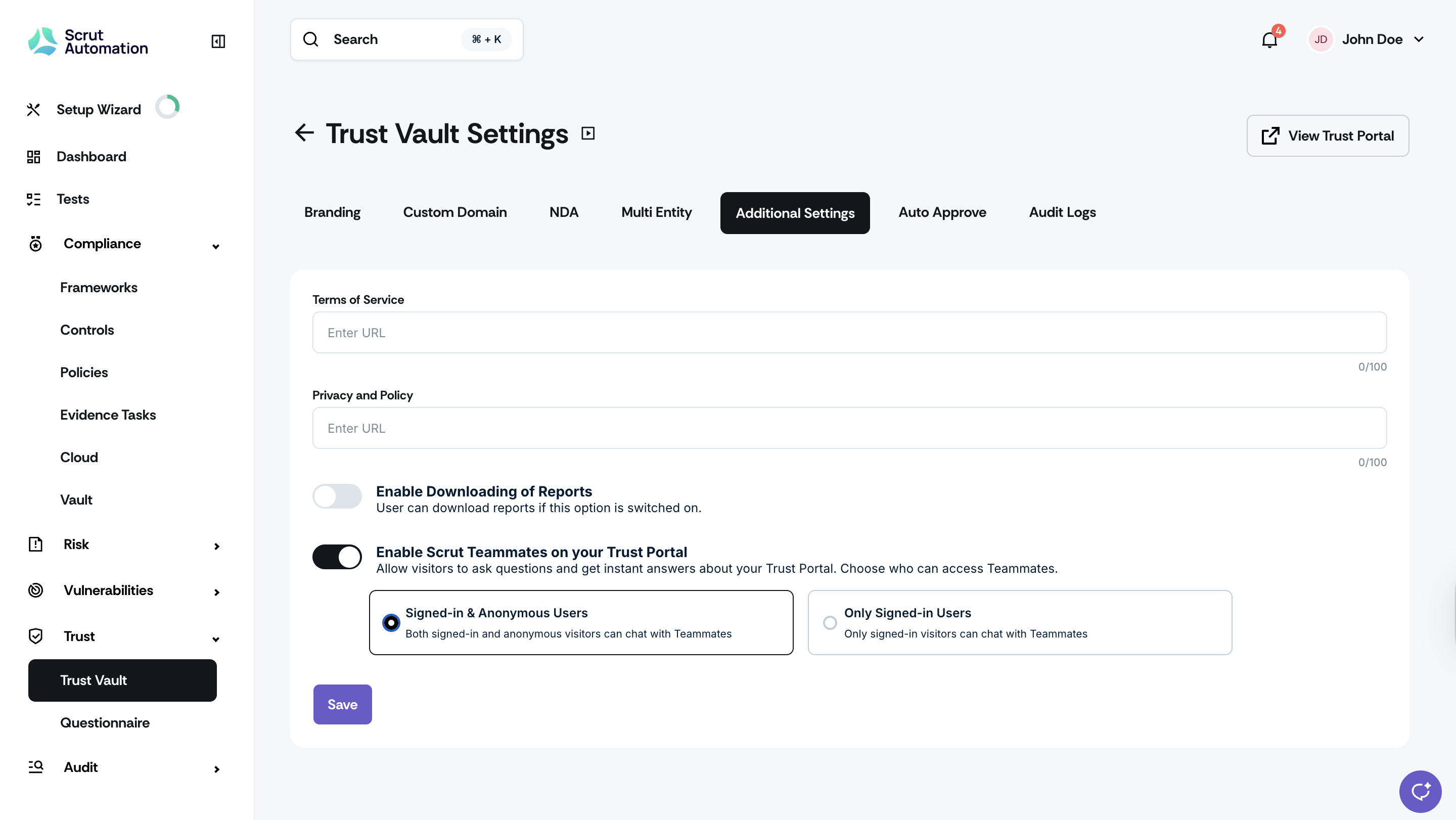 Teammates can now access and read content and documents on your Trust Portal. With this feature, visitors can chat with Teammates and get instant, contextual responses directly on your Trust Portal site.