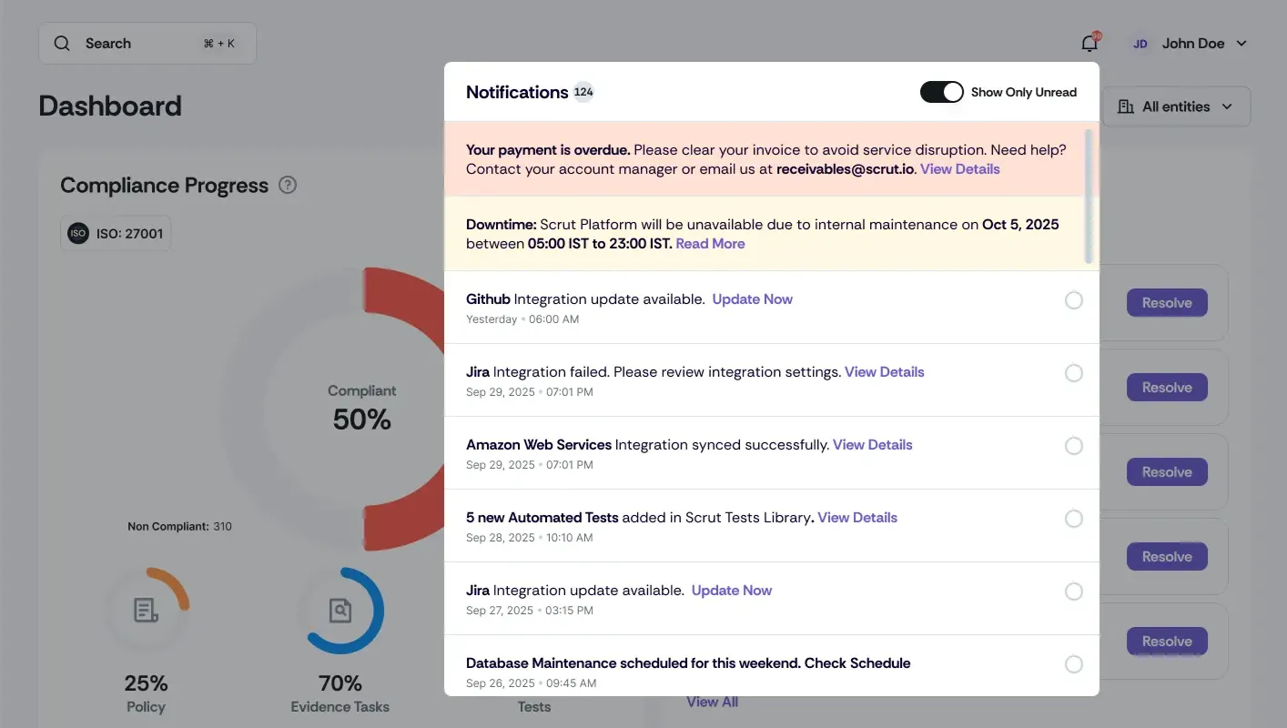 Click the bell icon in the top-right to open the Notification Center and view updates from across Scrut.
