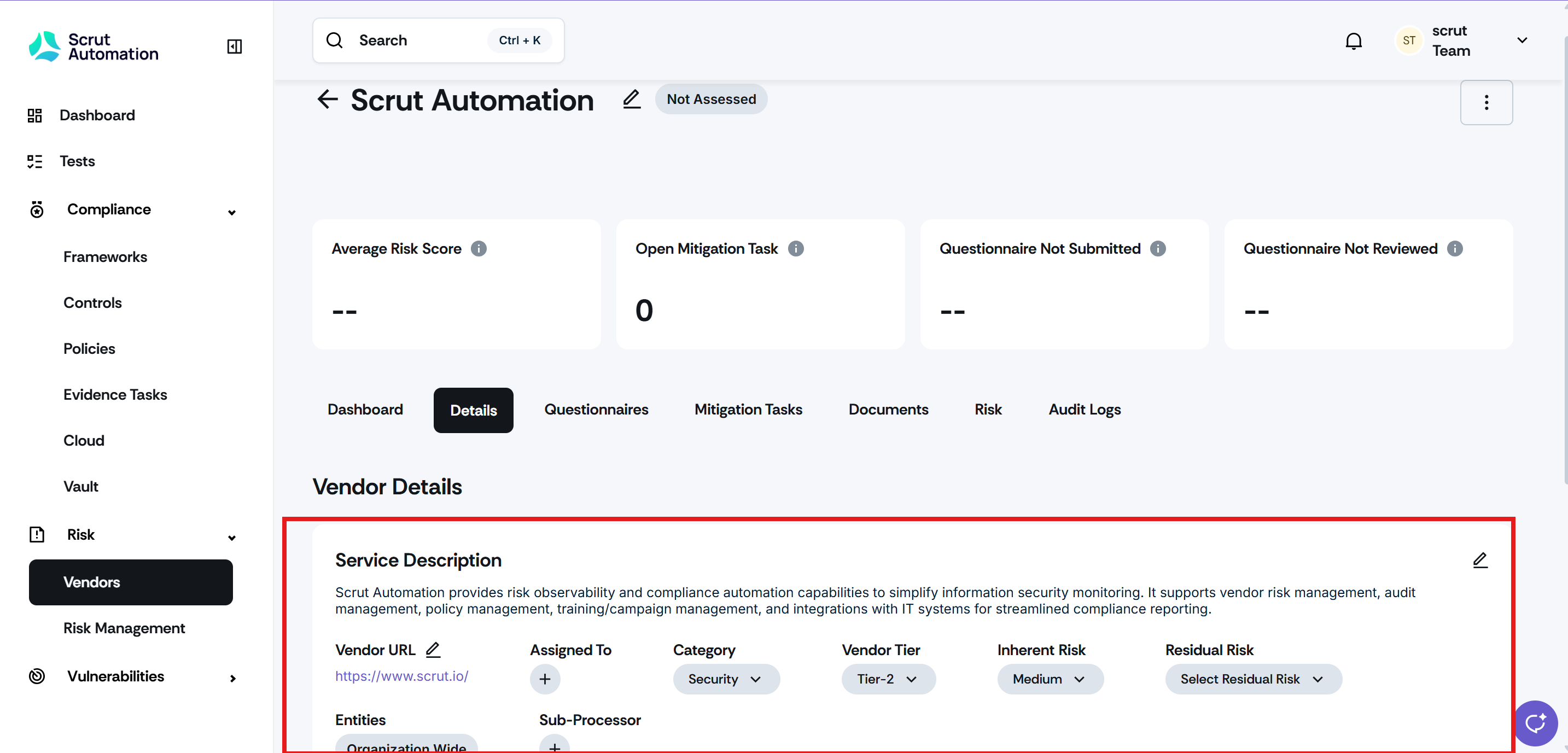 Scrut Automation now appears as a pre-populated default vendor for all new accounts, complete with key attributes like category, tier, inherent risk, and Trust Vault documentation. This vendor entry is fully editable and supports the same workflows as any other vendor in your account.