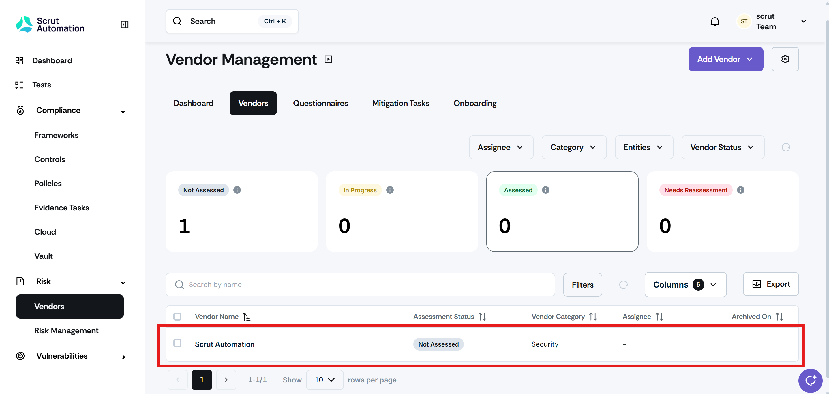 New accounts have Scrut pre-populated as a vendor for faster assessments