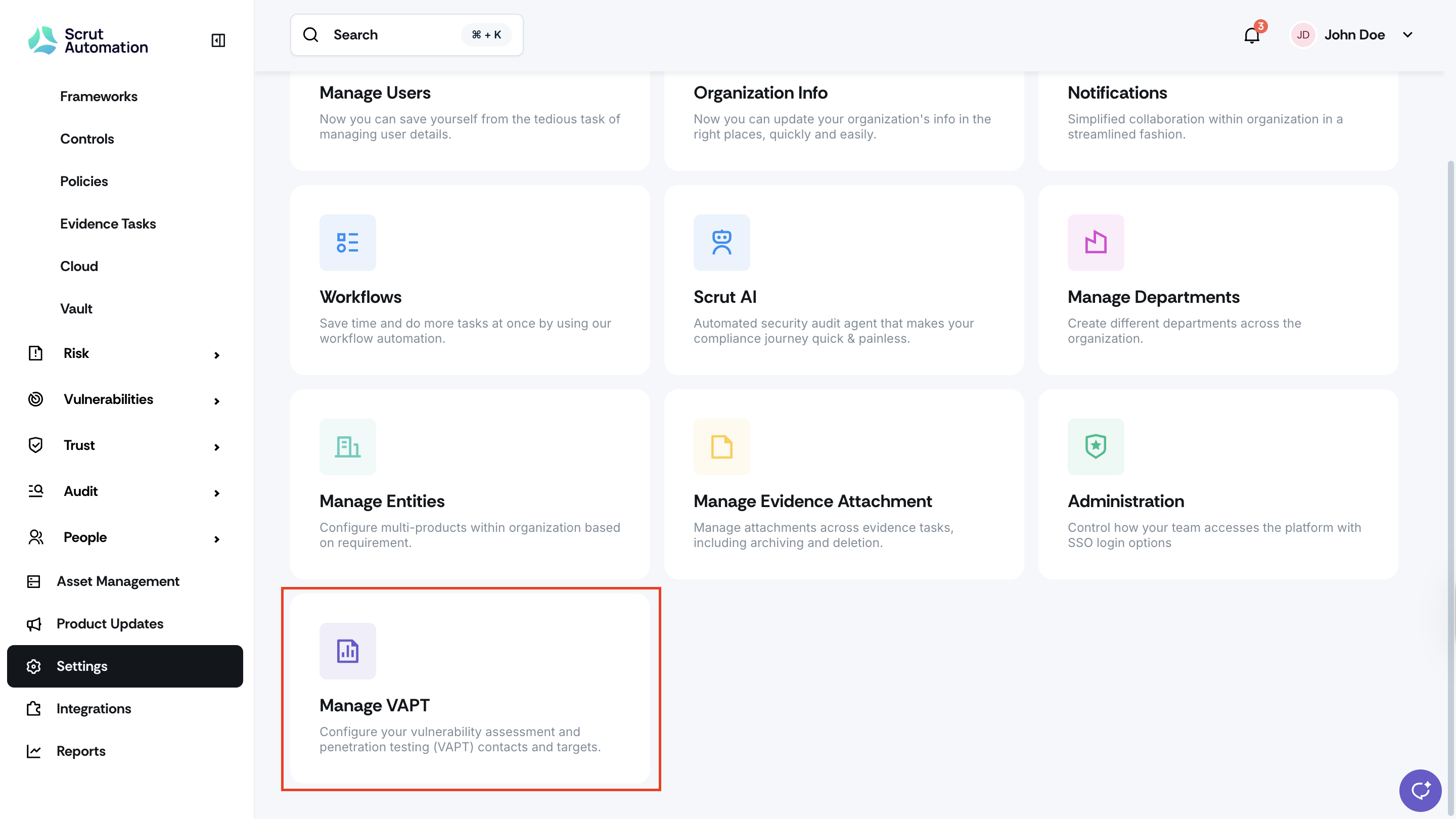Previously, submitting VAPT targets meant juggling emails, clarifying requirements, and tracking details across scattered threads, slowing down kickoffs and risking missing information. With this new feature, all VAPT details are available with the VAPT settings section in Scrut, eliminating coordination overhead and getting your security testing started faster.