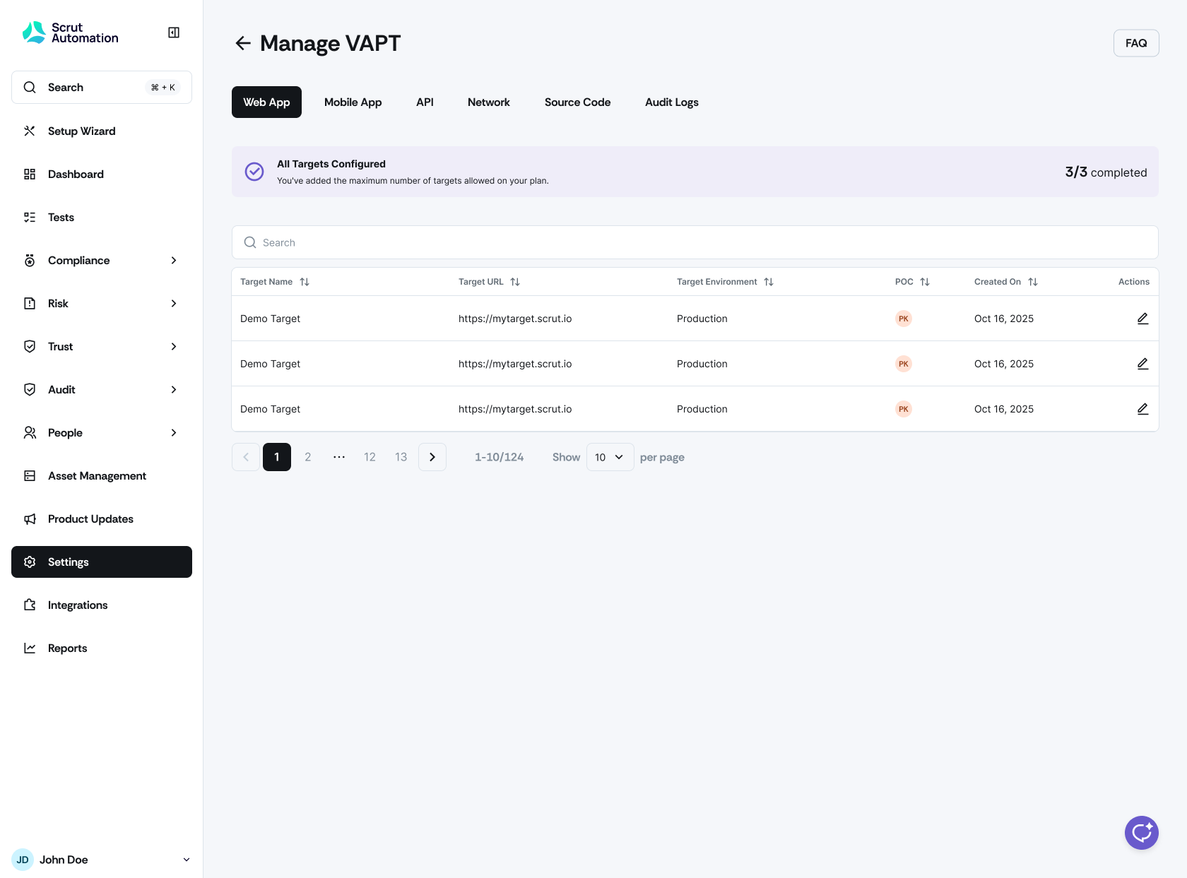 You can now submit and manage all VAPT target details directly in Scrut using guided, purpose-built forms for web, mobile, API, network, and source code targets. The new 'Manage VAPT' section under Settings provides a single, organized space to view, update, and track all VAPT targets, with automatic notifications sent to your CSM, VAPT team, and selected POCs whenever targets are added or updated.
