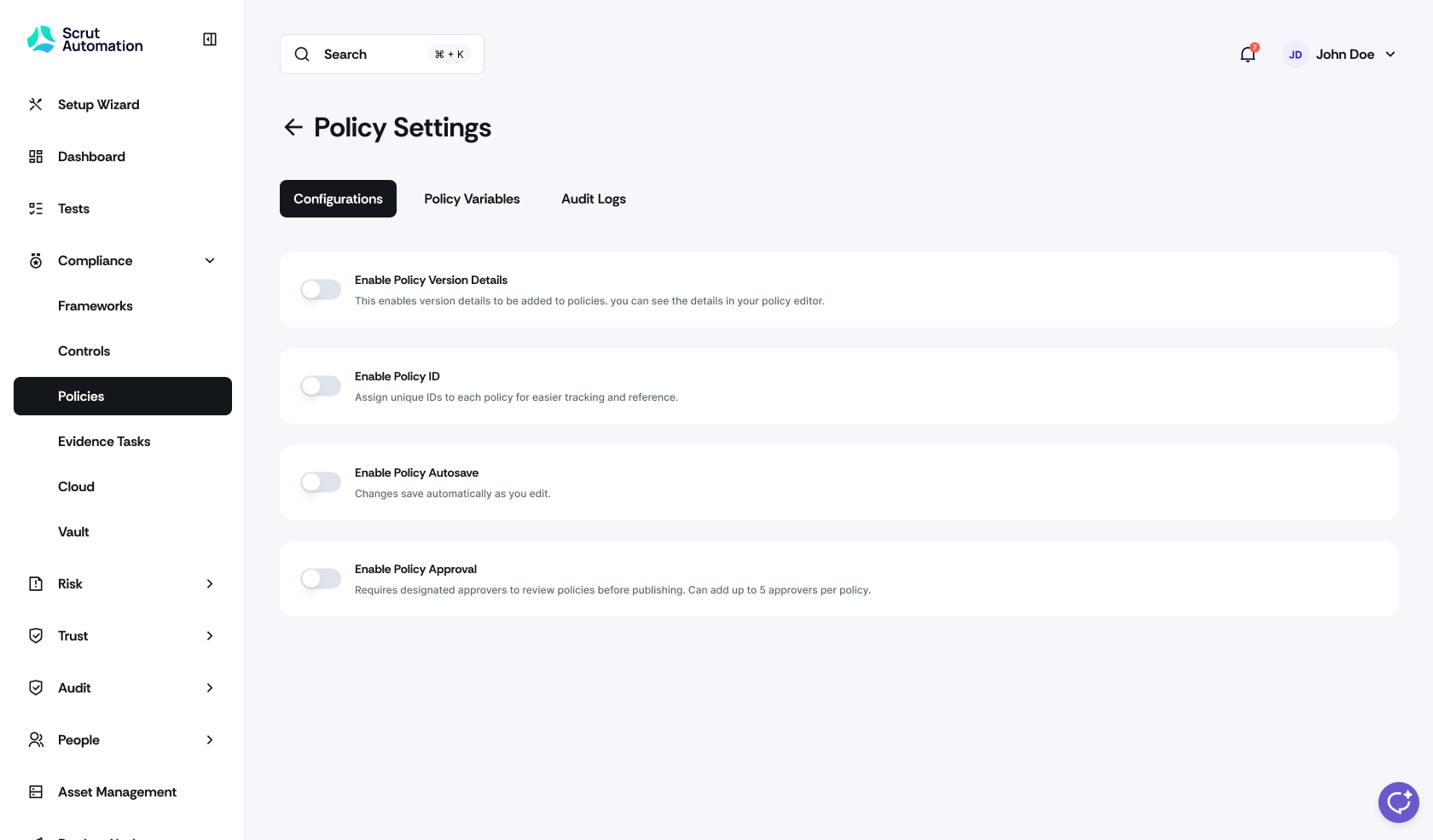 Navigate to the Configurations tab to toggle the Enable Policy Approval workflow on or off.