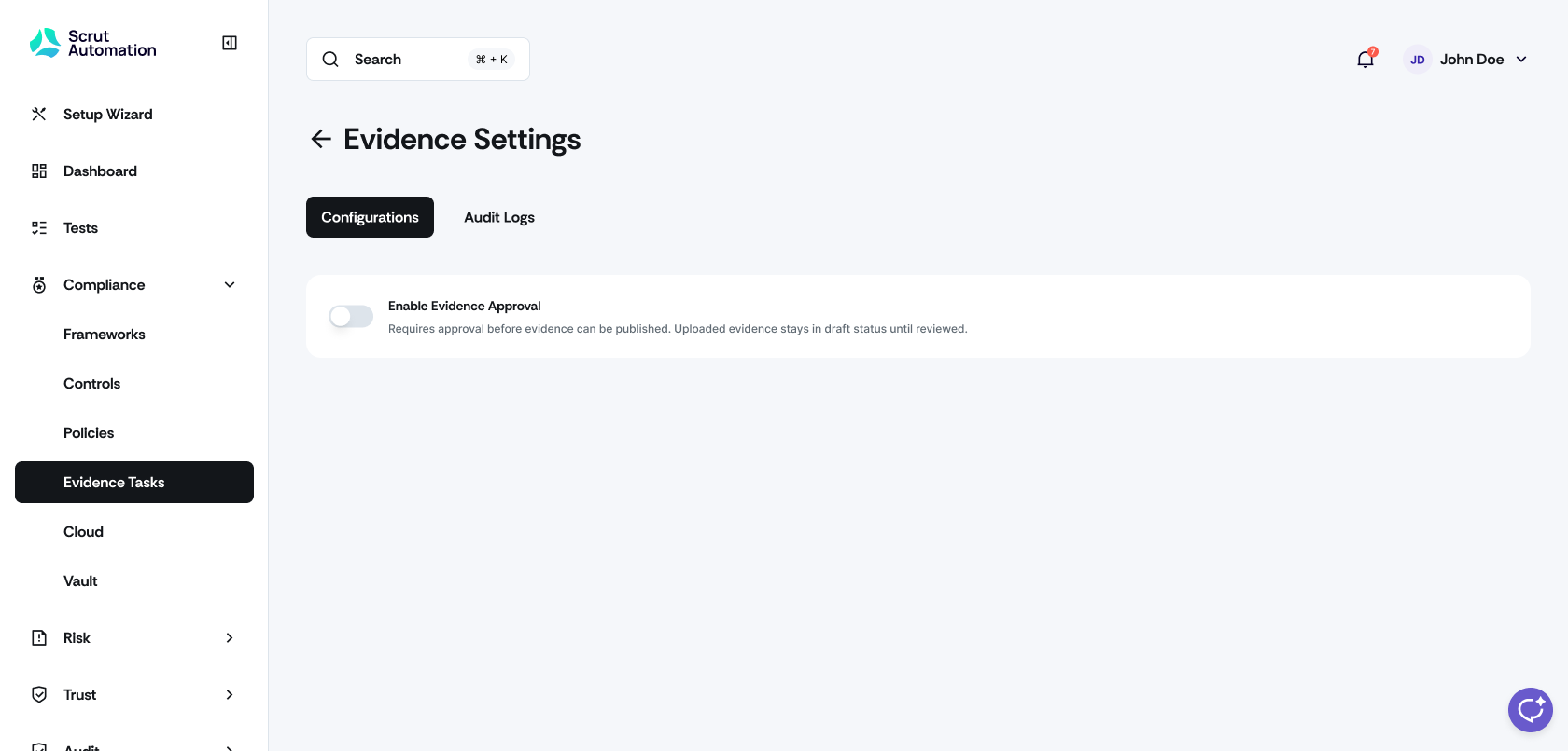 Navigate to the Configurations tab to toggle the Enable Evidence Approval workflow on or off.